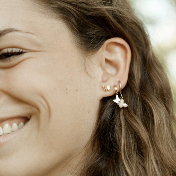 Set farfalla in acciaio inossidabile placcato oro. Set composto da 3 orecchini uno a lobo e 2 con cerchietto.