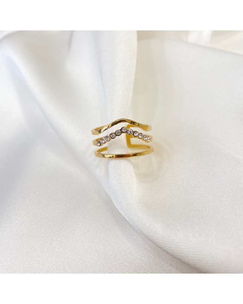 Anello trip in acciaio inossidabile placcato oro con doppia fascia e piccole pietre. Misura regolabile.