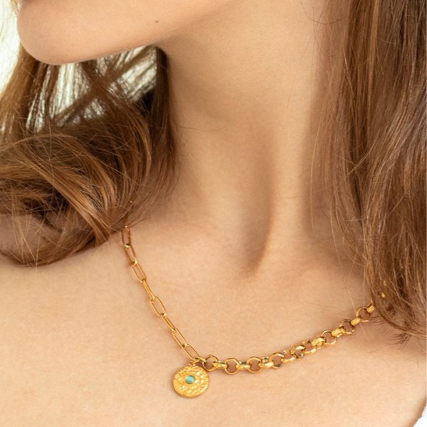 Collana blue eye in acciaio inossidabile placcato oro con piccola pietra naturale all'interno dell'occhio greco. La collana presenta due parti differenti nella stessa catena. Prodotto privo di nickel e piombo.